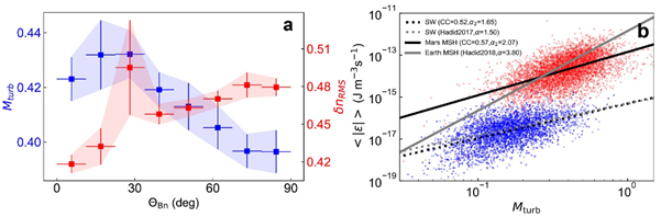 Figure 2. (a) Distributions of the turbulent Mach number and density fluctuation amplitude in the Martian magnetosheath as functions of the shock normal angle; (b) Statistical distributions of the compressible turbulence energy cascade rate in the solar wind upstream of the Martian bow shock and in the magnetosheath downstream as functions of the turbulent Mach number.